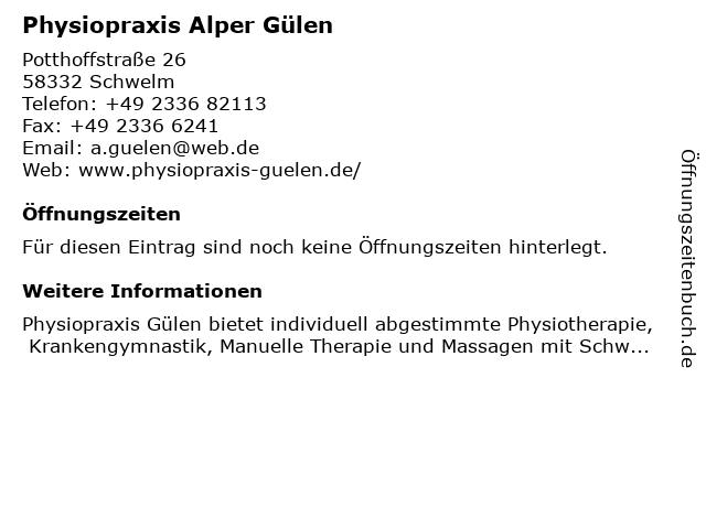 | Öffnungszeiten Physiopraxis Alper Gülen in Schwelm anzeigen | |