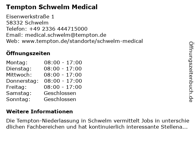 | Öffnungszeiten Tempton Schwelm Medical in Schwelm anzeigen | |