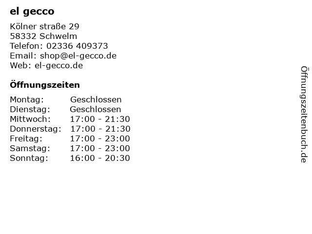 | Öffnungszeiten el gecco in Schwelm anzeigen | |