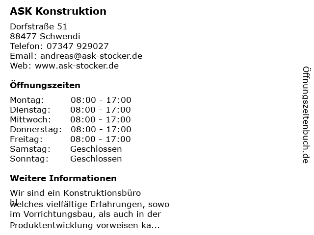 | Öffnungszeiten ASK Konstruktion in Schwendi anzeigen | |