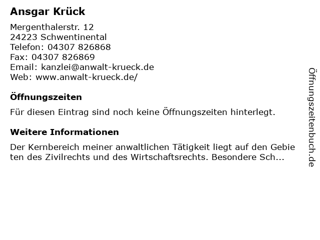 | Öffnungszeiten Ansgar Krück in Schwentinental anzeigen | |