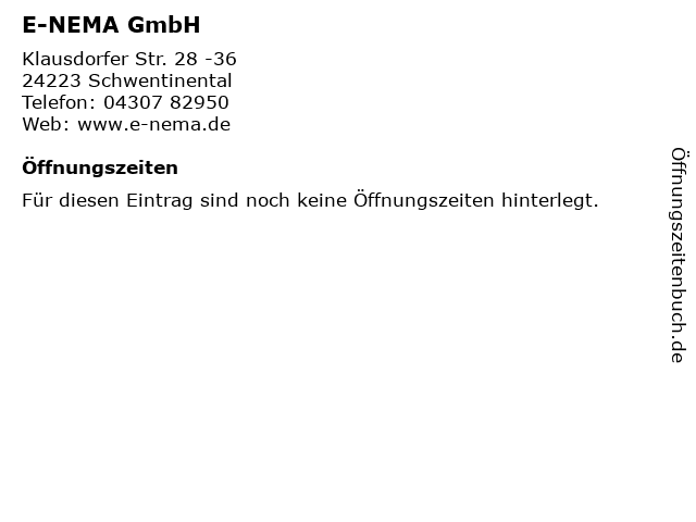 | Öffnungszeiten E-NEMA GmbH in Schwentinental anzeigen | |