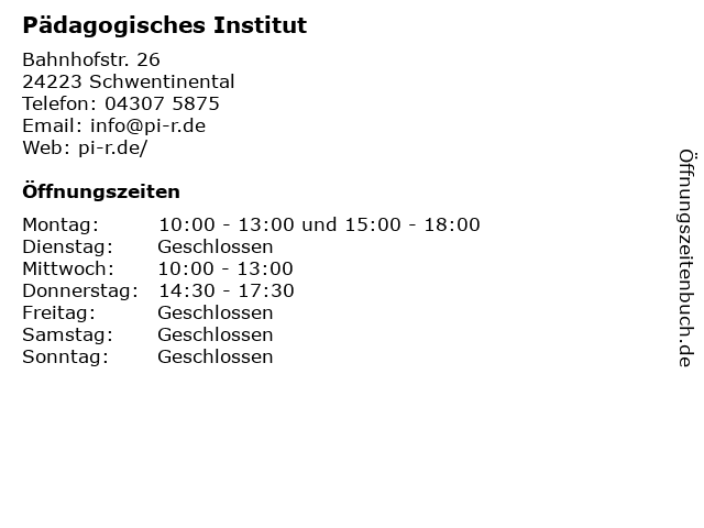 | Öffnungszeiten Pädagogisches Institut in Schwentinental anzeigen | |