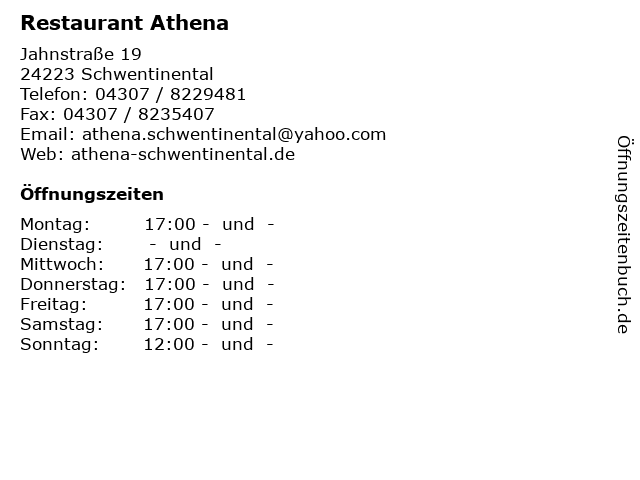 | Öffnungszeiten Restaurant Athena in Schwentinental anzeigen | |
