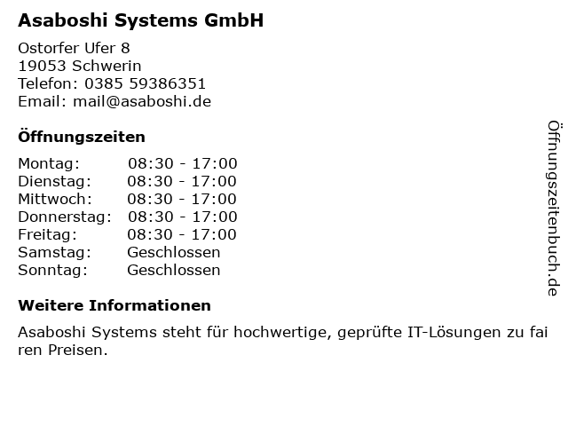 | Öffnungszeiten Asaboshi Systems GmbH in Schwerin anzeigen | |
