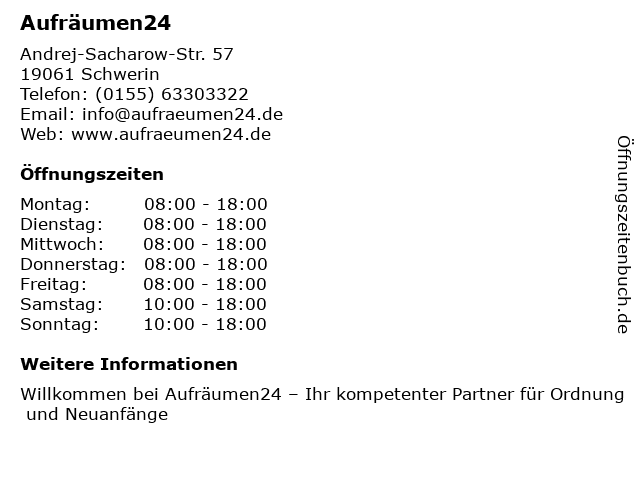 | Öffnungszeiten Aufräumen24 in Schwerin anzeigen | |