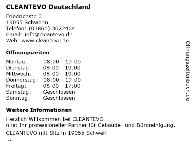 | Öffnungszeiten CLEANTEVO Deutschland in Schwerin anzeigen | |