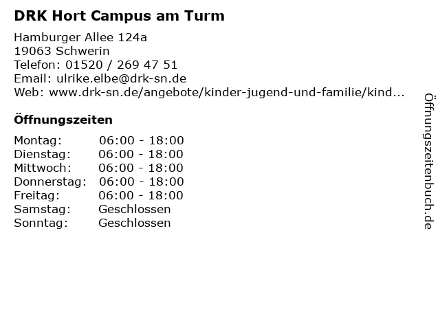 | Öffnungszeiten DRK Hort Campus am Turm in Schwerin anzeigen | |