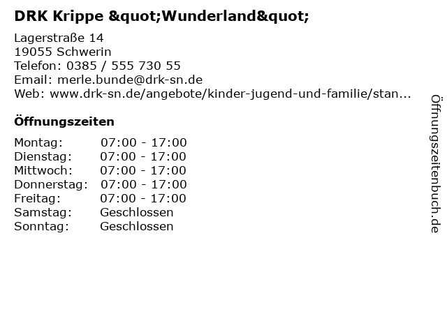 | Öffnungszeiten DRK Krippe "Wunderland" in Schwerin anzeigen | |