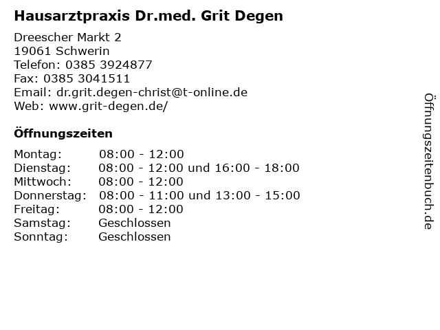 3 Augenarztpraxis Dr.med. Kathrin Müller & Dr. med. Grit Winkler (Sprechstunden Dr. Müller) (Entfernung: 2,89 km) Bleicher Ufer 13, 19053 Schwerin 4 Gutachterbüro Schwerin Dipl. Wiss. Org. Grit Zentsch (Entfernung: 3,21 km) Fritz-Reuter-Straße 30, 19053 Schwerin 6 |