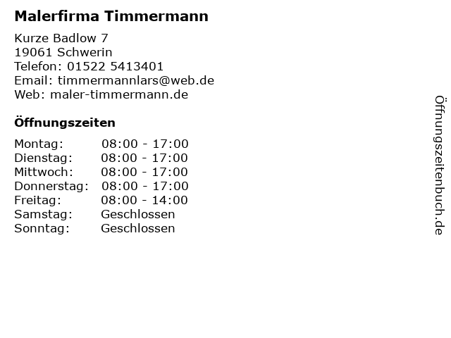 | Öffnungszeiten Malerfirma Timmermann in Schwerin anzeigen | |
