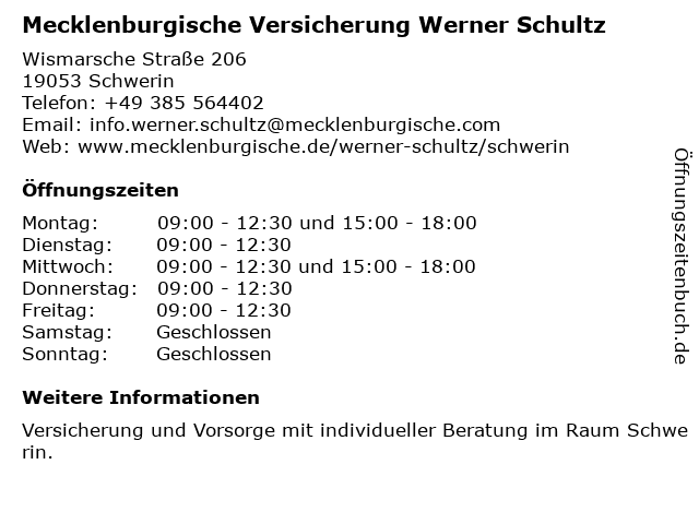 4 erste mecklenburgische porzellanmanufaktur e.K Kerstin Behrens (Entfernung: 3,53 km) Wendenhof 2, 19055 Schwerin 5 Mecklenburgische Versicherungsgruppe Agentur Burzlaff (Entfernung: 3,84 km) Ratzeburger Str. 2 C, 19057 Schwerin 6 |