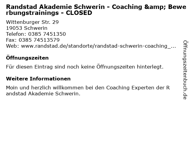 | Randstad Akademie Schwerin - Coaching & Bewerbungstrainings - CLOSED anrufen | |