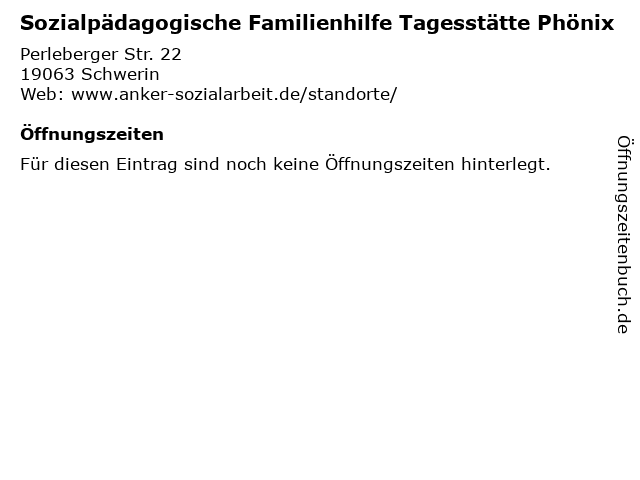 | Öffnungszeiten Sozialpädagogische Familienhilfe Tagesstätte Phönix in Schwerin anzeigen | |