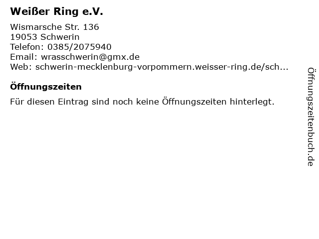 | Öffnungszeiten Weißer Ring e.V. in Schwerin anzeigen | |