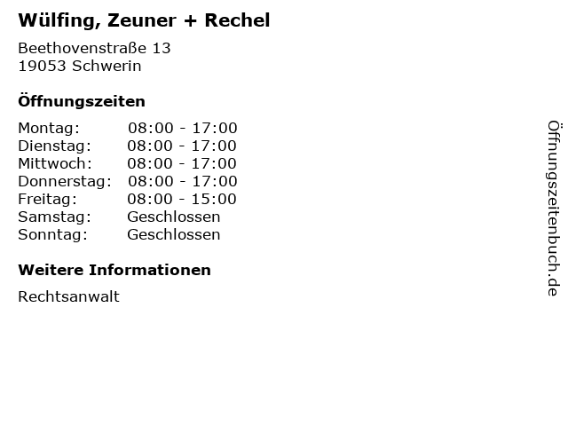 | Öffnungszeiten Wülfing, Zeuner + Rechel in Schwerin anzeigen | |