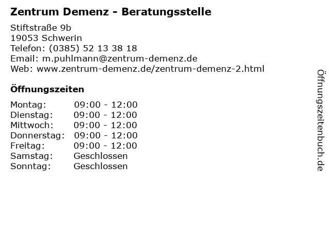 1 Beratungsstelle für Ehe-, Familien- u. Lebensfragen Psychologische Beratung (Entfernung: 0,14 km) Goethestr. 27, 19053 Schwerin 2 Beratungsstelle für sexuelle Gesundheit und Aufklärung in Westmecklenburg (Entfernung: 0,76 km) Lübecker Str. 43, 19053 Schwerin 3 Kontakt-, Informations- und Beratungsstelle für Selbsthilfegruppen Schwerin e.V. (Entfernung: 1,46 km) Spieltordamm 9, 19055 Schwerin 4 Diakoniewerk Neues Ufer gGmbH Kontakt- und Beratungsstelle (Entfernung: 1,50 km) Bergstr. 31, 19055 Schwerin 6 Beratungsstelle Blinden- und Sehbehinderten-Verein Mecklenburg-Vorpommern e.V. (Entfernung: 4,41 km) Perleberger Straße 22, 19063 Schwerin |