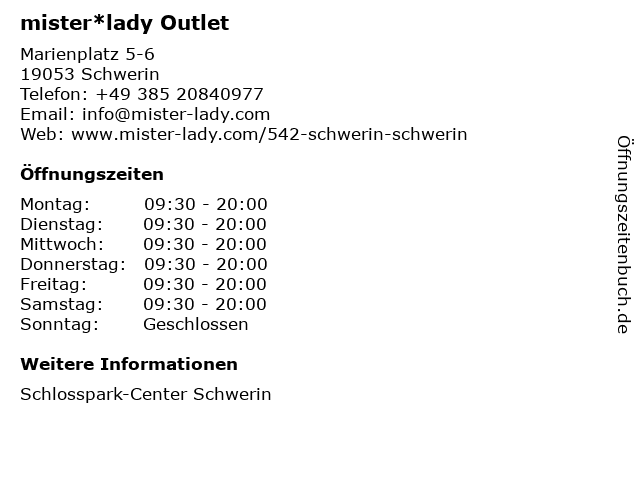 | Öffnungszeiten mister*lady Outlet in Schwerin anzeigen | |