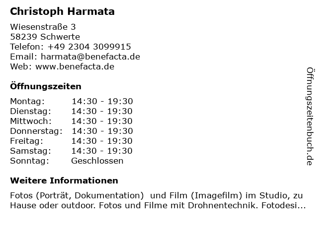 | Öffnungszeiten Christoph Harmata in Schwerte anzeigen | |