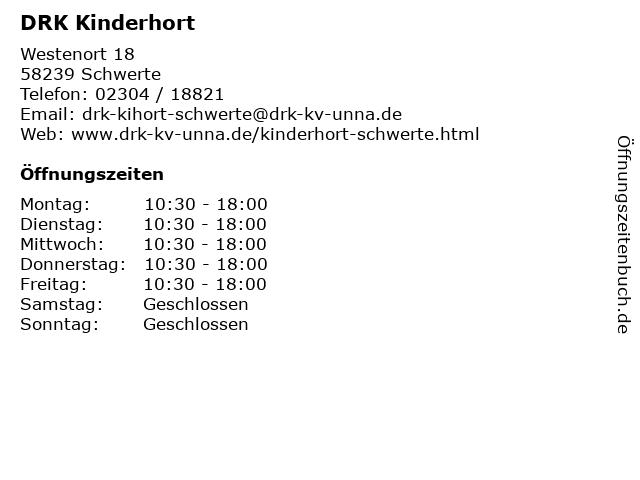 | Öffnungszeiten DRK Kinderhort in Schwerte anzeigen | |