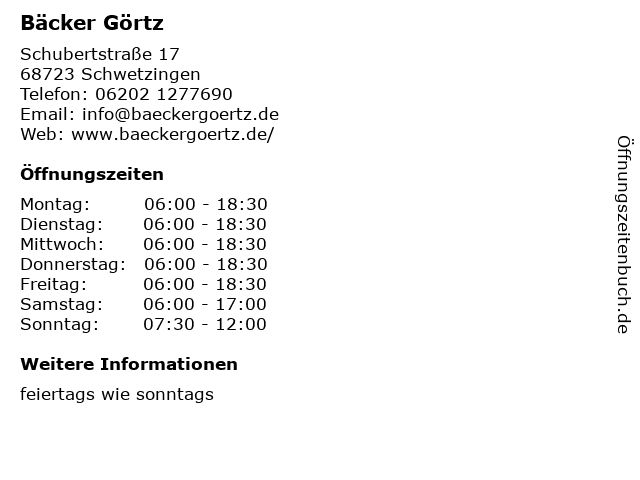 | Öffnungszeiten Bäcker Görtz in Schwetzingen anzeigen | |
