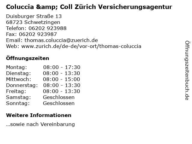 1 Zurich Versicherungen - Geschäftsstelle Rainer Schaefer (Entfernung: 8,74 km) Fichtestr. 20, 69126 Heidelberg 5 Zurich Versicherungen - Filialdirektion Rüdiger Saam e. K. (Entfernung: 12,44 km) Schwerdstr 43a, 67346 Speyer 6 |