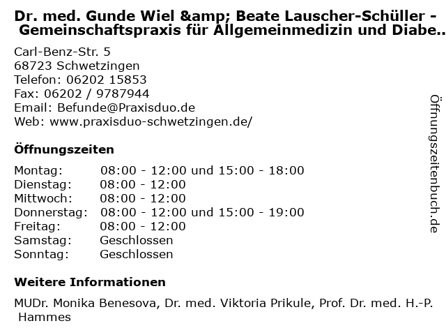 Branchen & Suchbegriffe zu Dr. med. Gunde Wiel & Beate Lauscher-Schüller - Gemeinschaftspraxis für Allgemeinmedizin und Diabetologie:allgemeinmedizin, beate, diabetologie, dr., fachärztinnen, gemeinschaftspraxen, gemeinschaftspraxis, gesundheit, gunde, hausärzte, innere, internisten, kassenpatienten, lauscher, med., medizin, schüller, wiel, ärzte |