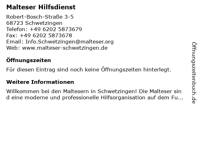 | Öffnungszeiten Malteser Hilfsdienst in Schwetzingen anzeigen | |