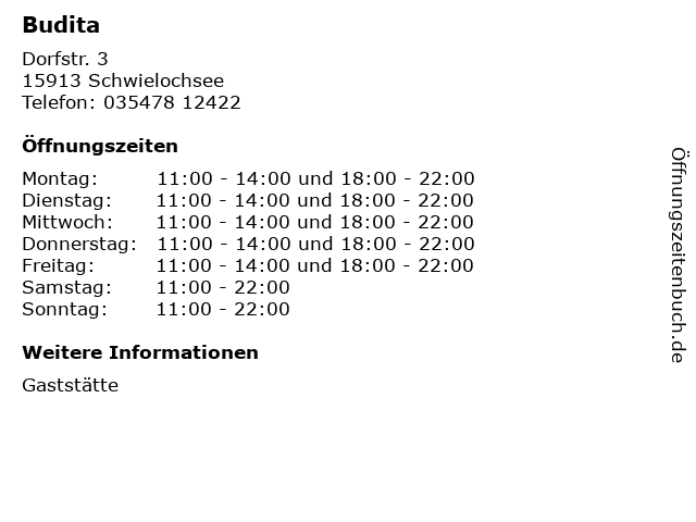 | Öffnungszeiten Budita in Schwielochsee anzeigen | |