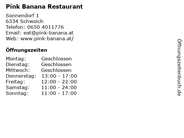 | Öffnungszeiten Pink Banana Restaurant in Schwoich anzeigen | |