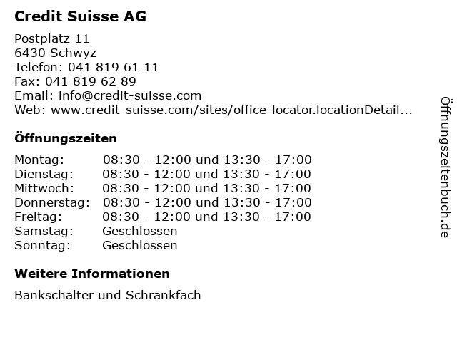| Öffnungszeiten Credit Suisse AG in Schwyz anzeigen | |