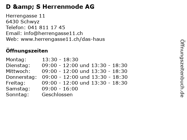 | Öffnungszeiten D & S Herrenmode AG in Schwyz anzeigen | |