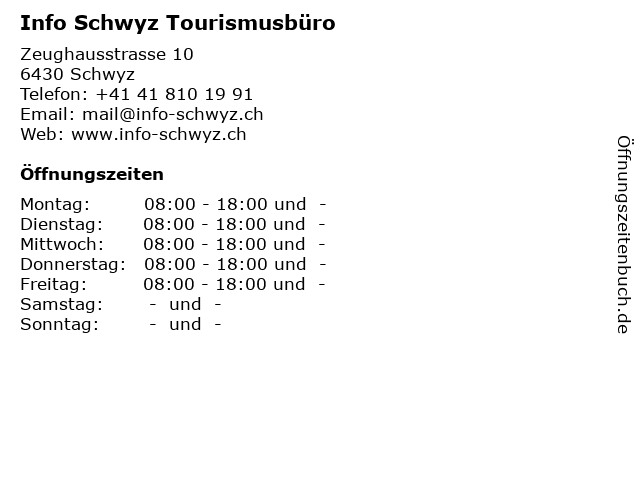 | Öffnungszeiten Info Schwyz Tourismusbüro in Schwyz anzeigen | |