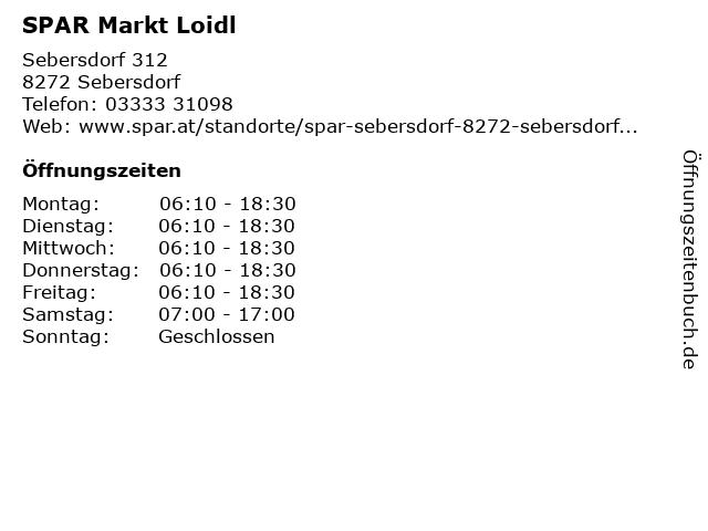 | Öffnungszeiten SPAR Markt Loidl in Sebersdorf anzeigen | |