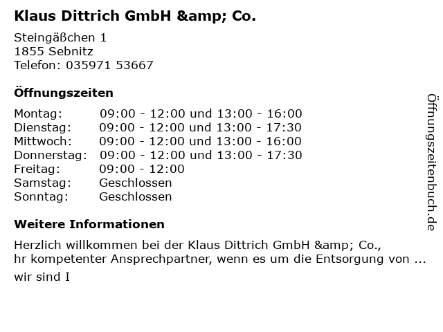 | Öffnungszeiten Klaus Dittrich GmbH & Co. in Sebnitz anzeigen | |