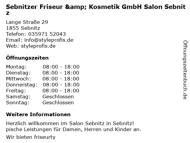 4 Sebnitzer Ing.-Büro ImportExport GmbH & Co. KG (Entfernung: 0,80 km) Am Sonnenblick 14, 01855 Sebnitz 5 Friseur und Kosmetik GmbH Salon Siegrun Friseur (Entfernung: 14,18 km) Neukircher Str. 17, 01877 Schmölln-Putzkau 6 |