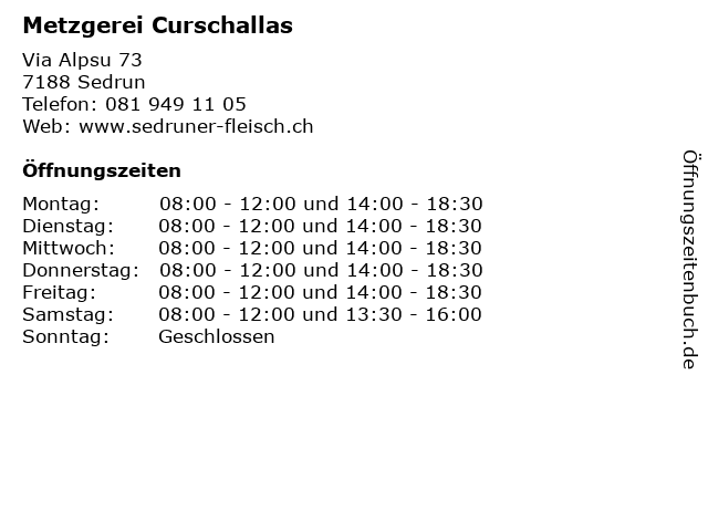 | Öffnungszeiten Metzgerei Curschallas in Sedrun anzeigen | |