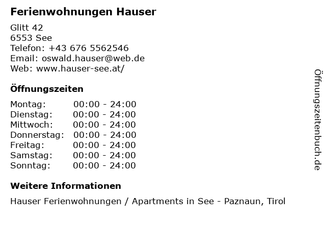 | Öffnungszeiten Ferienwohnungen Hauser in See anzeigen | |