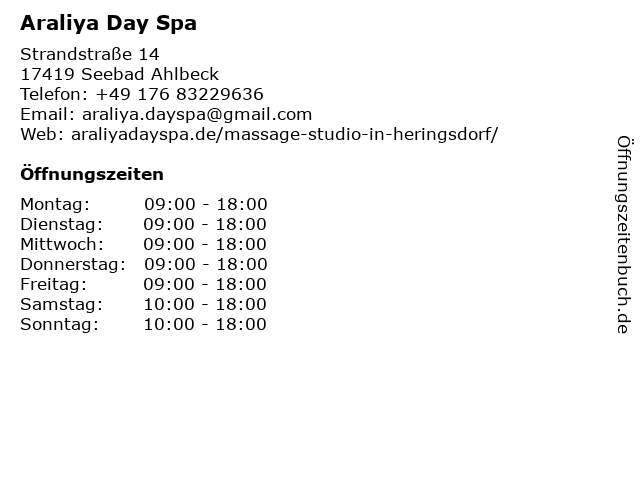| Öffnungszeiten Araliya Day Spa in Seebad Ahlbeck anzeigen | |