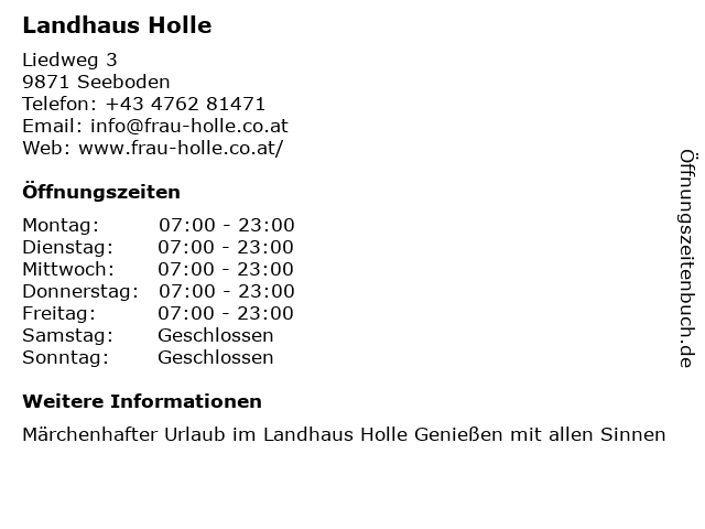 | Öffnungszeiten Landhaus Holle in Seeboden anzeigen | |