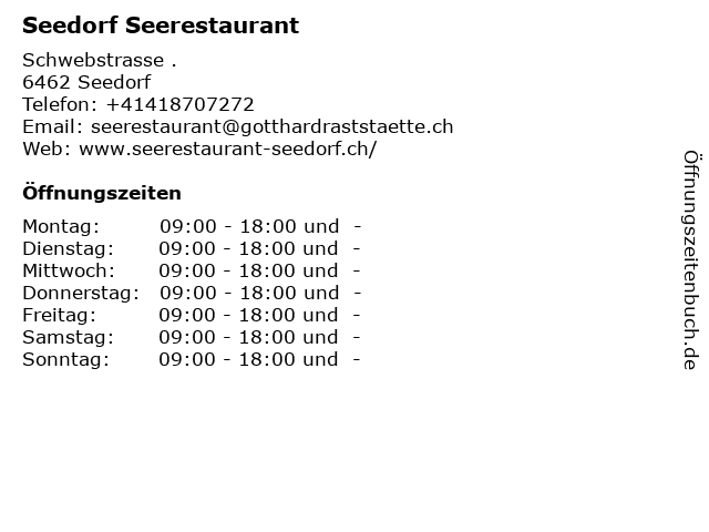 | Öffnungszeiten Seedorf Seerestaurant in Seedorf anzeigen | |