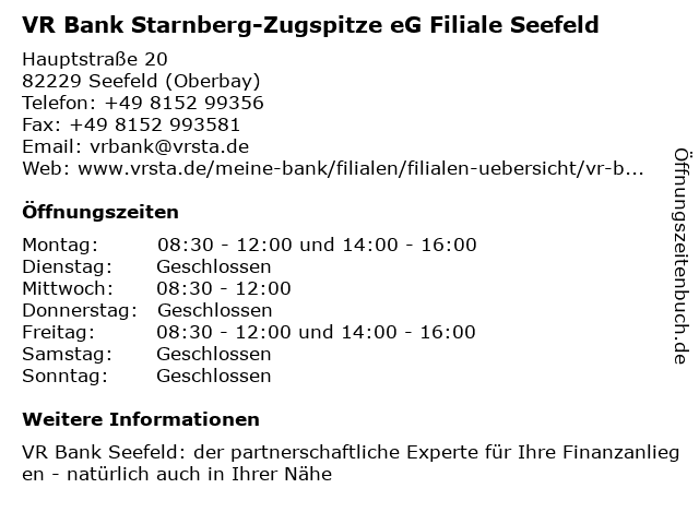 2 3 VR Bank Starnberg-Zugspitze eG SB Filiale Hechendorf (Entfernung: 1,77 km) Günteringer Straße 2, 82229 Seefeld 4 VR Bank Starnberg-Herrsching-Landsberg eG - VR Bank Hechendorf (Entfernung: 1,77 km) Günteringer Straße 2, 82229 Hechendorf 5 VR Bank Starnberg-Zugspitze eG Filiale Wörthsee (Entfernung: 3,79 km) Etterschlagerstraße 17a, 82237 Wörthsee 6 VR Bank Starnberg-Herrsching-Landsberg eG - VR Bank Breitbrunn (Entfernung: 5,80 km) Hauptstraße 10a, 82211 Breitbrunn |