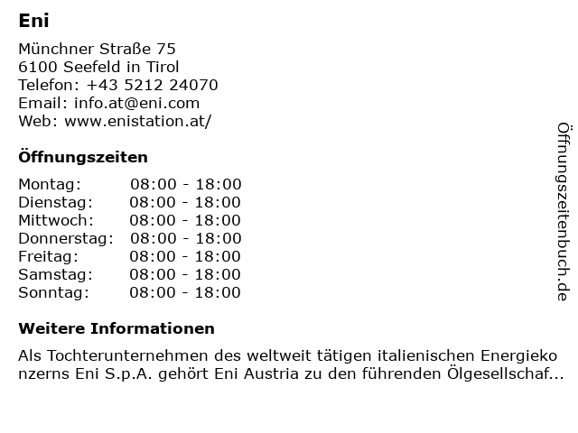 | Öffnungszeiten Eni in Seefeld in Tirol anzeigen | |