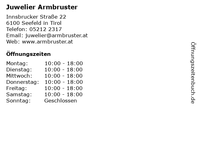 | Öffnungszeiten Juwelier Armbruster in Seefeld in Tirol anzeigen | |