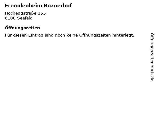 | Öffnungszeiten Fremdenheim Boznerhof in Seefeld anzeigen | |