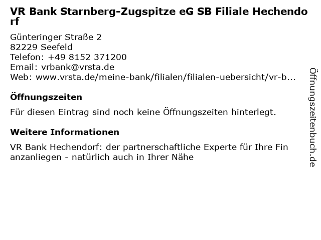 | VR Bank Starnberg-Zugspitze eG SB Filiale Hechendorf anrufen | |