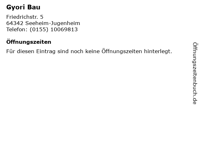 | Öffnungszeiten Gyori Bau in Seeheim-Jugenheim anzeigen | |