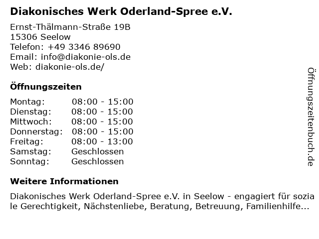 | 2 Deutsches Rotes Kreuz Kreisverband Märkisch- Oderland-Ost e.V. (Entfernung: 0,46 km) Feldstraße 2a, 15306 Seelow 3 Diakonisches Werk Oderland-Spree e.V. - Sucht- und Drogenberatung (Entfernung: 0,54 km) Feldstraße 3e, 15306 Seelow 5 Tagespflege "Vergissmeinnicht" - Diakonisches Werk Oderland-Spree e.V. (Entfernung: 1,13 km) Straße der Jugend 9A, 15306 Seelow 6 TBG Transportbeton Oder-Spree GmbH & Co. KG (Entfernung: 3,39 km) Waldsiedlung Fichtendamm 1, 15306 Vierlinden |