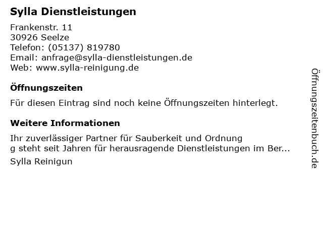 | Öffnungszeiten Sylla Dienstleistungen in Seelze anzeigen | |