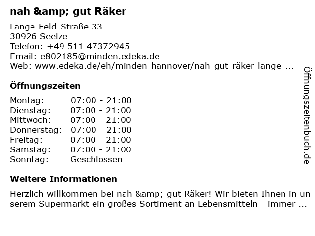 | Telefonnummer nah & gut Räker in Seelze (+49 511 47372945) anrufen | |